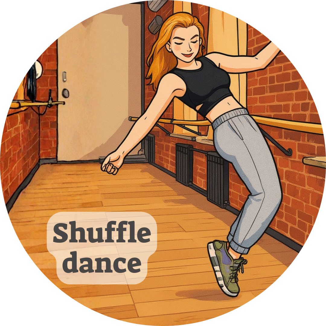 Shuffle dance je plný rýchlych krokov, dynamických presunov a rytmu. Pomáha deťom uvoľniť prebytočnú energiu, zlepšuje kondíciu, koordináciu a celkovú fyzickú zdatnosť. Pohyb je prirodzený, zábavný a deti sa učia vnímať svoje telo v rytme hudby.